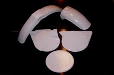This plastic kit includes a front fender, rear fender, pair of side panels, and a front number plate unit. All of the plastic is grey.